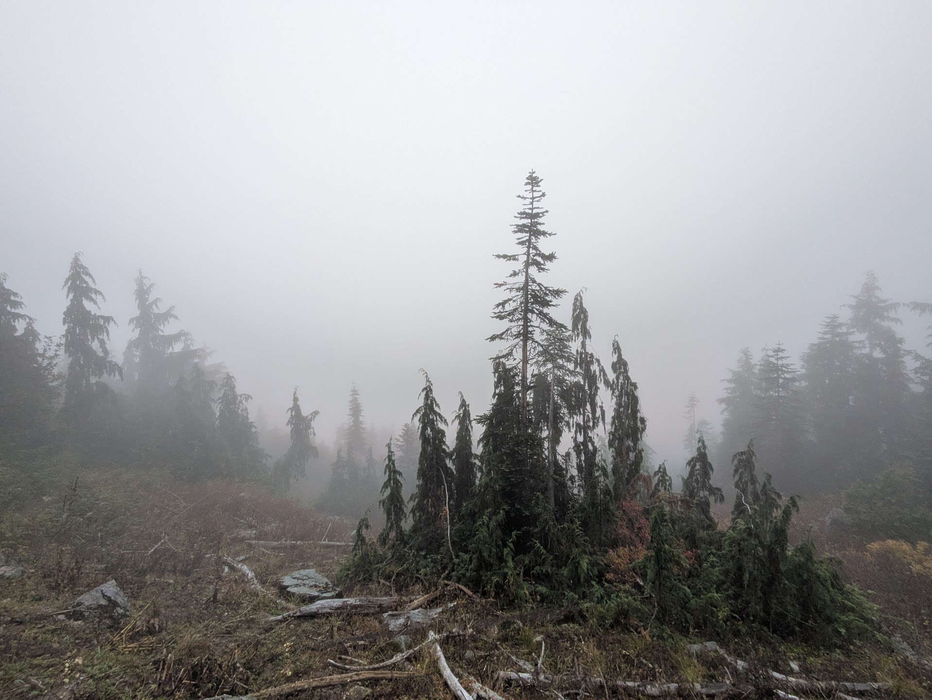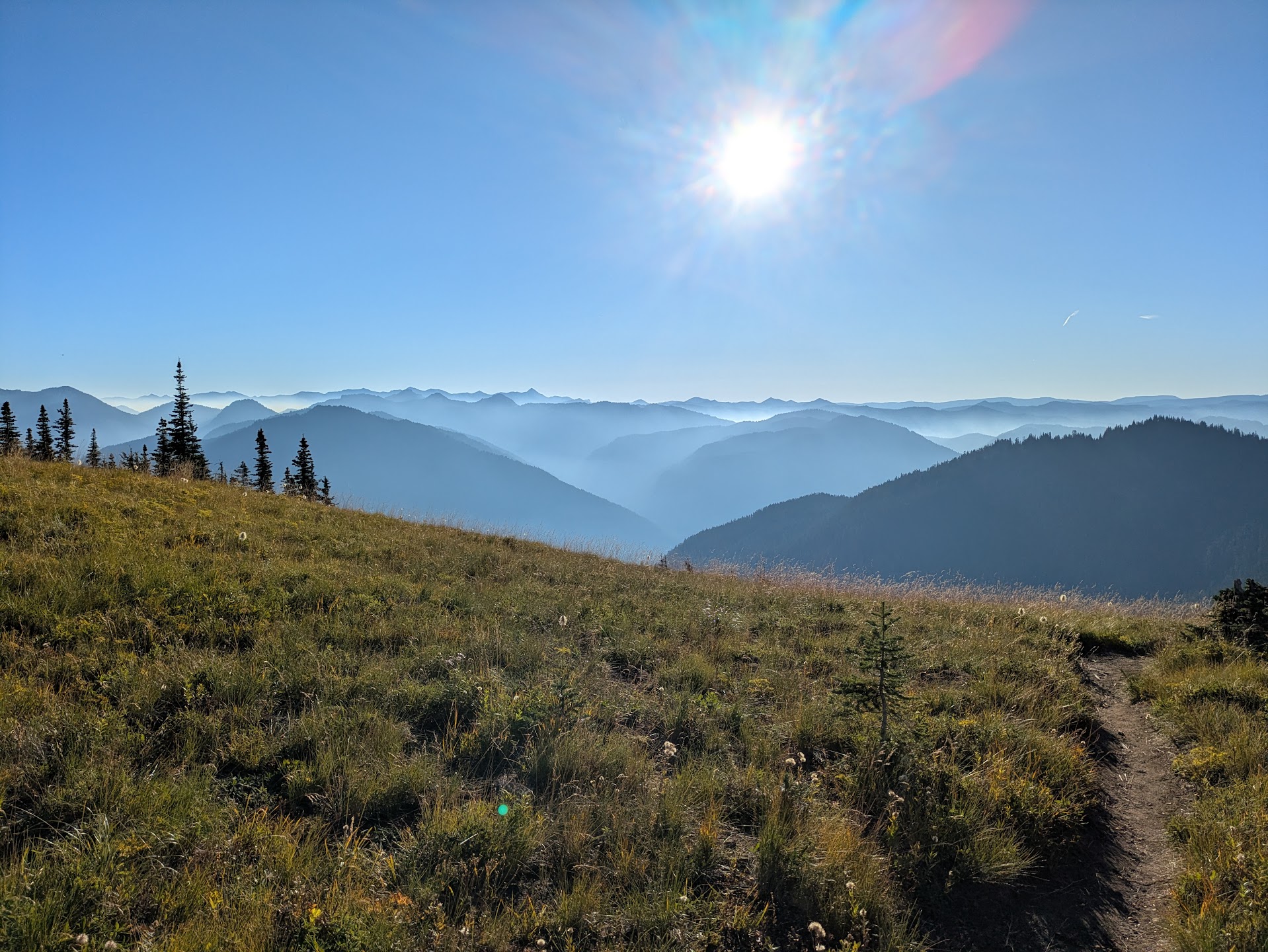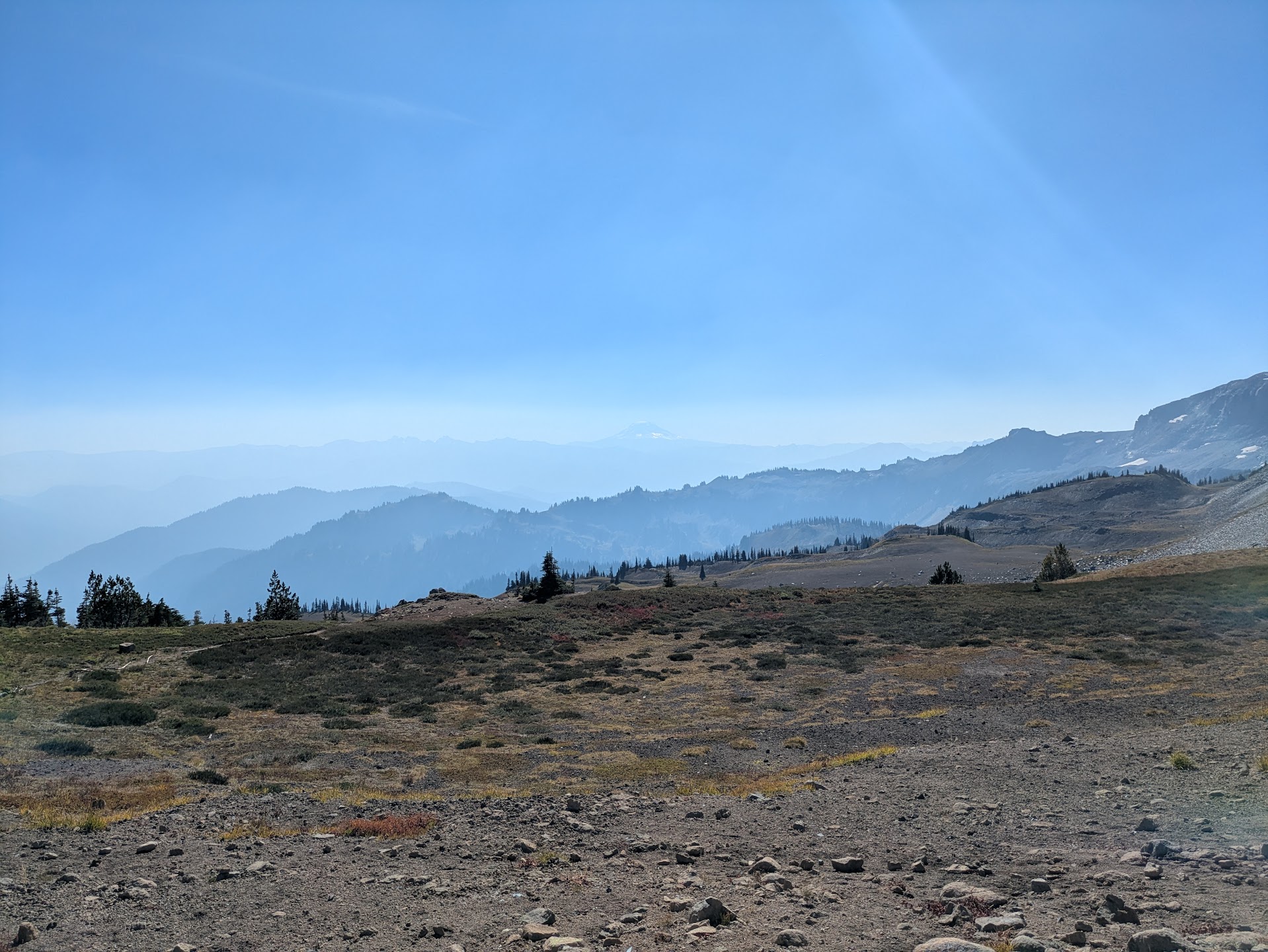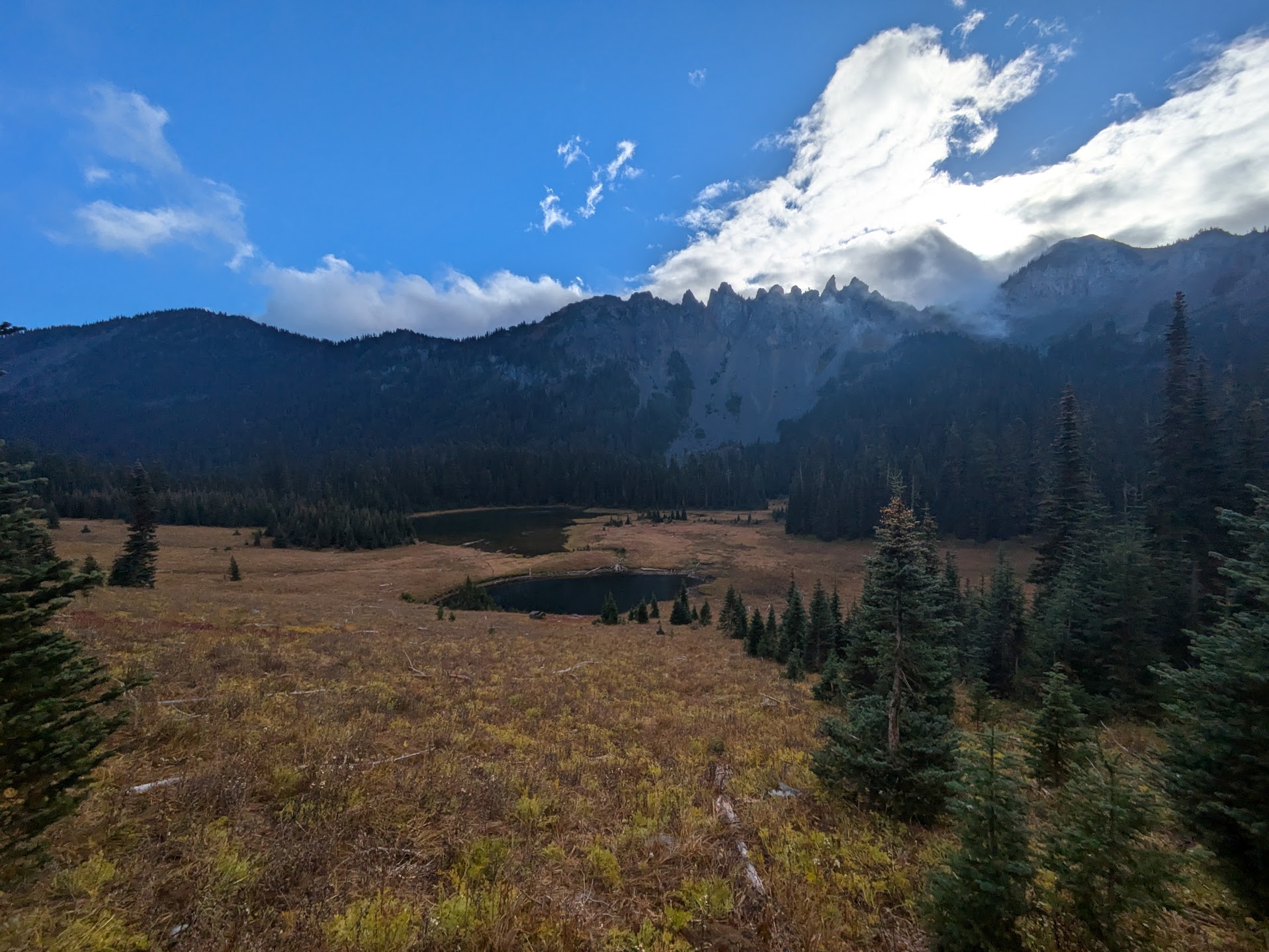 The climb to Tamanos Creek was cold and misty. I kept my jacket on and my hands covered. Thick clouds hid any view of Rainier or surrounding mountains so I just focused on moving steadily up the long series of switchbacks. At the top, the fog lifted and the sun came through, lighting up the meadows. One meadow had a large lake in the distance before starting the final descent—a smooth, wide trail that made for the easiest hiking of the trip. I had to hike a bit of road at the end, but I reached the car at 10:45, ahead of schedule.