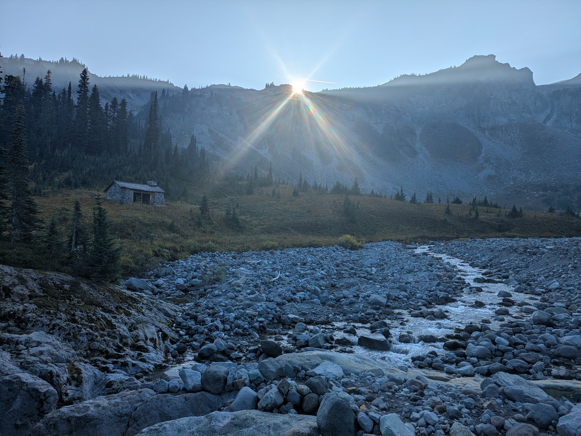 The next part of the hike is the descent down into Indian Bar, a scenic subalpine meadow cut by the Ohanapecosh River. The landscape is dramatic: high ridges, meadows of wildflowers, waterfalls, cliffs, and river terrain combine for a striking alpine environment. It also features a rustic trail shelter built by the Civilian Conservation Corps in 1940. This place has special significance to me because in my teens my dad and I spent a night backpacking here together. Those trips with him are among my favorite memories and helped shape who I am today. I thought about him more than usual during this trip.