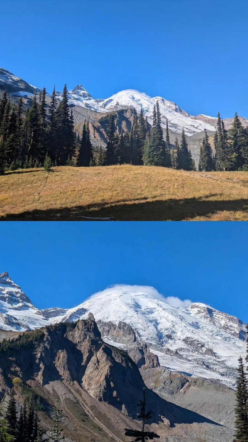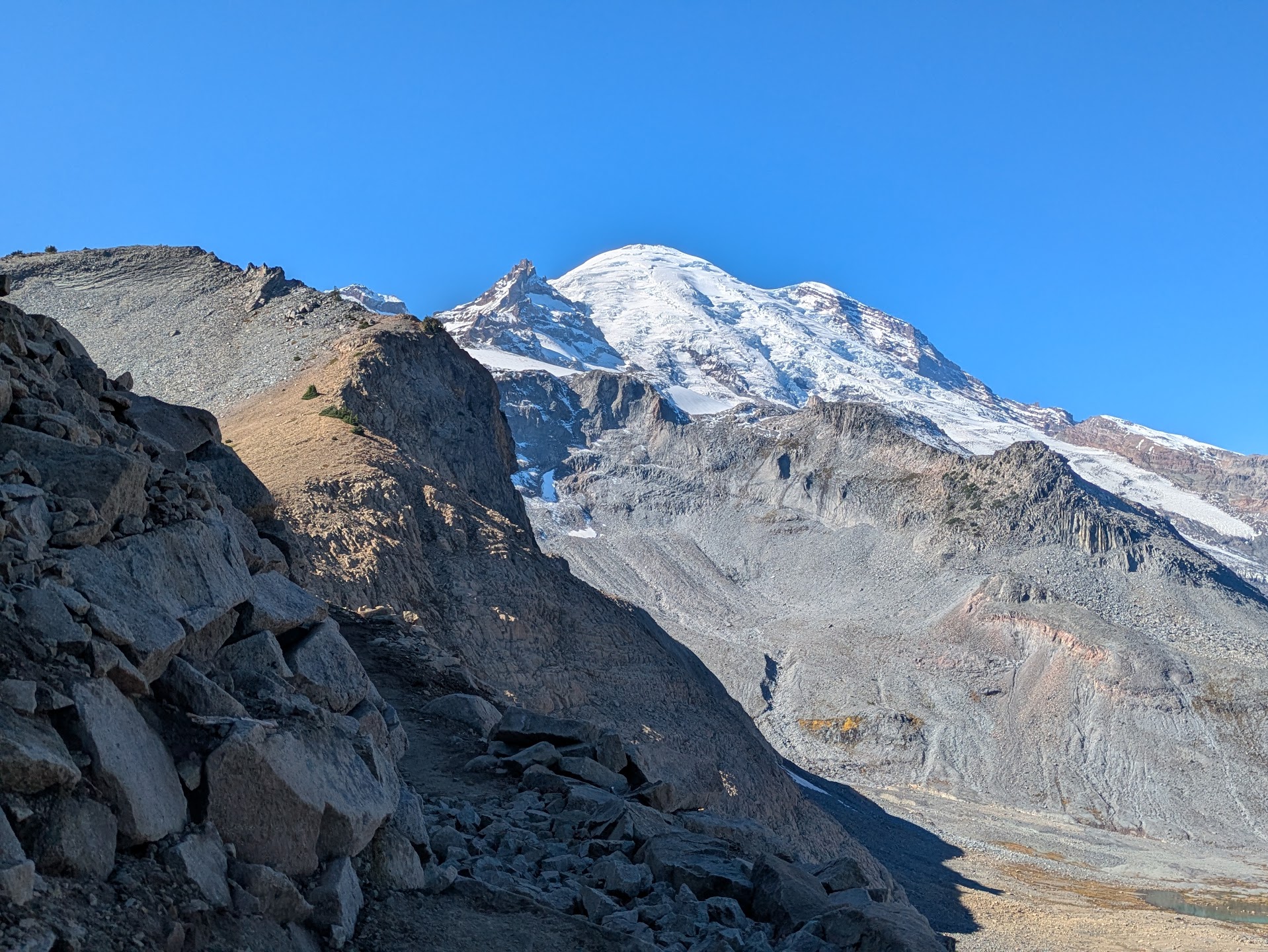 Through the meadow, the view of Rainier and Little Tahoma was crystal clear. Rainier had a light cloud of mist hovering just above its summit.
