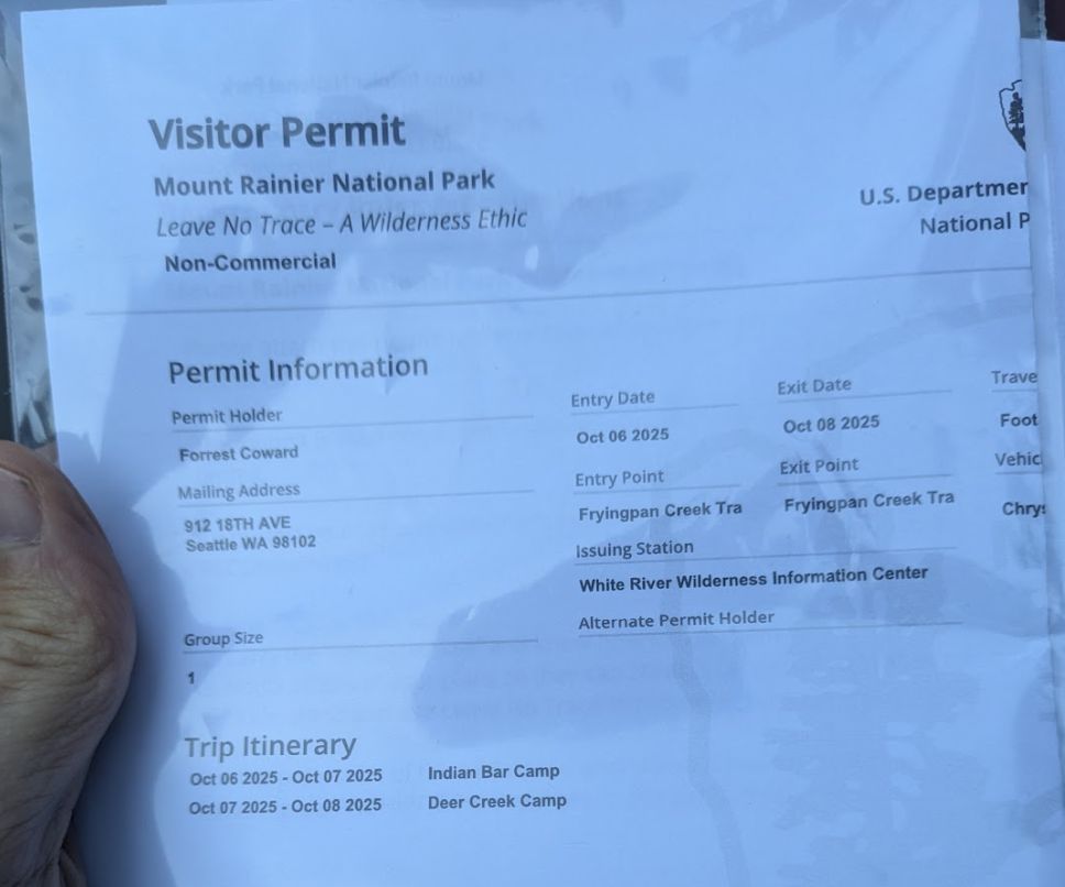 Days before the trip, I received an email saying the route was still open and that I could “activate” my permit at the White River Wilderness Information Center in person the day of. I was crossing my fingers given late in the season, plus the shutdown, I would be able to reschedule this trip for just two nights. Otherwise, I would just have to take my chances and bum a site if full.